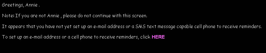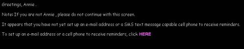 If you do not have a reminder destination (e-mail account or cell phone) set up to receive reminders (the first time you access this, you will not), you will be presented with the following screen: