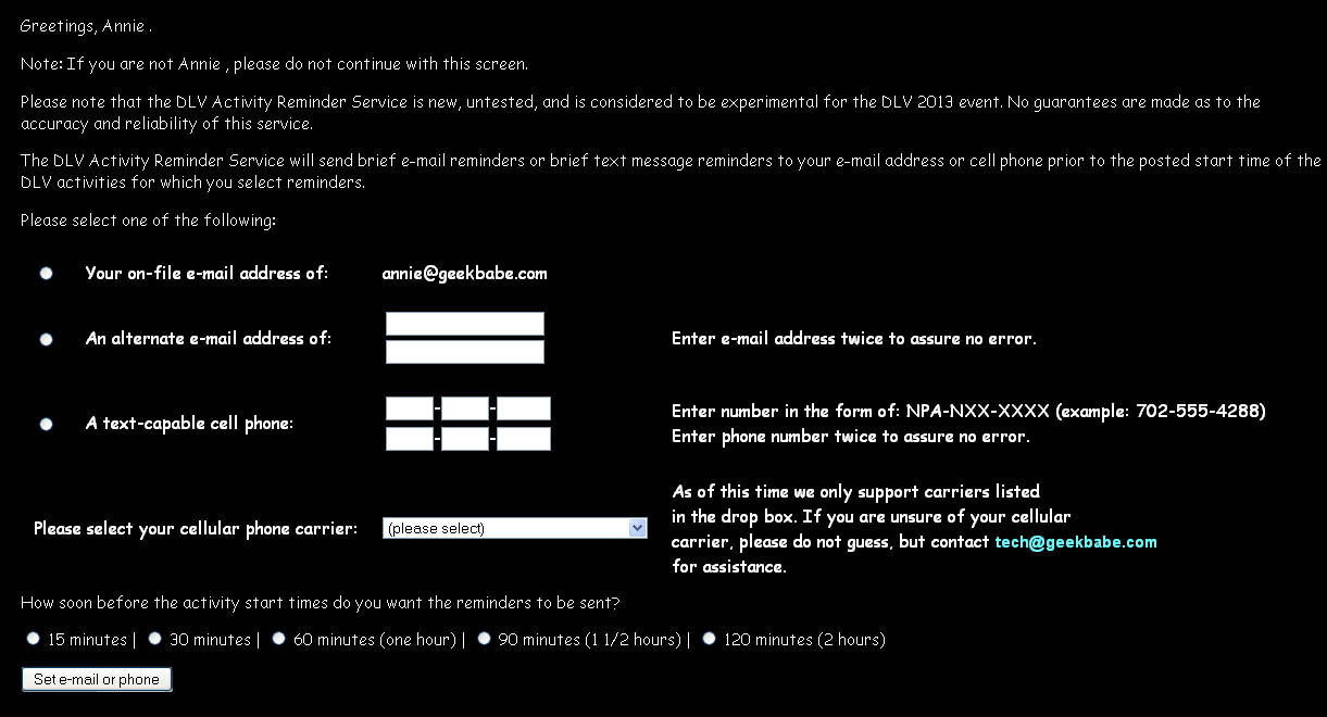 When the destination and reminder lead time are complete and correct, click the "Set e-mail or phone" button. If no errors have occured, the following screen will appear (click to enlarge):