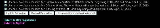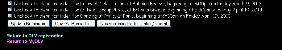 You will then see a fairly large screen listing all DLV activities along with a checkbox to set a reminder for each activity. The example below shows only the very bottom of this screen, inncluding the buttons available to update the reminders and other information.